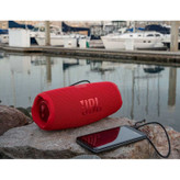 اسپیکر پرتابل و بلوتوثی JBL Charge 5 نسل جدید اسپیکر های سری شارژ از برند محبوب جی بی ال است. این اسپیکر قابل حمل با درایور های بهبود یافته و سخت افزار بروز شده ، تجربهی صوتی متفاوتی را به شما ارائه می دهد. همچنین طراحی ظاهری زیبا و چشمگیر آن همراه با بدنهی ضدآب و مقاوم ، شما را با سطح جدیدی از سیستم های صوتی پرتابل آشنا می کند. دلیل نامگذاری این اسپیکر ظرفیت بالای باتری و امکان شارژ دستگاه های دیگر توسط باتری اسپیکر است همچنین برای اتصال این اسپیکر به دستگاه های پخش مانند گوشی موبایل یا پلیر ها ، از تکنولوژی بلوتوث استفاده شده است تا بتوانید به راحتی به این اسپیکر متصل شده و به صورت بی سیم موسیقی مورد علاقه خود را بشنوید. جی بی ال در سری جدید اسپیکر شارژ از بلوتوث نسخه 5.1 که جدید ترین نسخه در حال حاضر است استفاده کرده است و این اسپیکر حرفهای دارای صدای قدرتمند و شفافی است که توسط درایور های جدید و بهبود یافته تولید و پخش می شود. یک عدد ووفر Racetrack-Shaped به همراه توئیتر جداگانه و پسیو رادیاتور های دوگانه در کنار هم تجربهی صوتی جدید و بی نظیری را برای شما فراهم می کنند و فرکانس های بیس و میدرنج (Low - Mid) در این اسپیکر از طریق 1 عدد ووفر 52×90 میلی متری با توان خروجی 30 وات RMS و فرکانس های تریبل (High) نیز توسط 1 عدد توئیتر 20 میلی متری با توان خروجی 10 وات RMS پخش می شوند. در مجموه این محصول قادر است تا صدایی به قدرت 40 وات RMS را تولید کرده و به گوش شما برساند. بازه فرکانسی قابل پخش در این سیستم صوتی مابین 65 هرتز تا 20000 هرتز است که برای اسپیکری با این ابعاد فوق العاده است. اسپیکر Charge 5 یکی از محصولاتی است که واژهی JBL Pro Sound را به تصویر می کشد.