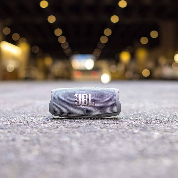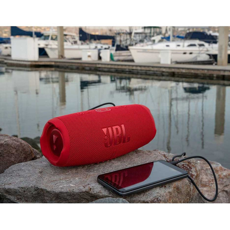 اسپیکر پرتابل و بلوتوثی JBL Charge 5 نسل جدید اسپیکر های سری شارژ از برند محبوب جی بی ال است. این اسپیکر قابل حمل با درایور های بهبود یافته و سخت افزار بروز شده ، تجربهی صوتی متفاوتی را به شما ارائه می دهد. همچنین طراحی ظاهری زیبا و چشمگیر آن همراه با بدنهی ضدآب و مقاوم ، شما را با سطح جدیدی از سیستم های صوتی پرتابل آشنا می کند. دلیل نامگذاری این اسپیکر ظرفیت بالای باتری و امکان شارژ دستگاه های دیگر توسط باتری اسپیکر است همچنین برای اتصال این اسپیکر به دستگاه های پخش مانند گوشی موبایل یا پلیر ها ، از تکنولوژی بلوتوث استفاده شده است تا بتوانید به راحتی به این اسپیکر متصل شده و به صورت بی سیم موسیقی مورد علاقه خود را بشنوید. جی بی ال در سری جدید اسپیکر شارژ از بلوتوث نسخه 5.1 که جدید ترین نسخه در حال حاضر است استفاده کرده است و این اسپیکر حرفهای دارای صدای قدرتمند و شفافی است که توسط درایور های جدید و بهبود یافته تولید و پخش می شود. یک عدد ووفر Racetrack-Shaped به همراه توئیتر جداگانه و پسیو رادیاتور های دوگانه در کنار هم تجربهی صوتی جدید و بی نظیری را برای شما فراهم می کنند و فرکانس های بیس و میدرنج (Low - Mid) در این اسپیکر از طریق 1 عدد ووفر 52×90 میلی متری با توان خروجی 30 وات RMS و فرکانس های تریبل (High) نیز توسط 1 عدد توئیتر 20 میلی متری با توان خروجی 10 وات RMS پخش می شوند. در مجموه این محصول قادر است تا صدایی به قدرت 40 وات RMS را تولید کرده و به گوش شما برساند. بازه فرکانسی قابل پخش در این سیستم صوتی مابین 65 هرتز تا 20000 هرتز است که برای اسپیکری با این ابعاد فوق العاده است. اسپیکر Charge 5 یکی از محصولاتی است که واژهی JBL Pro Sound را به تصویر می کشد.