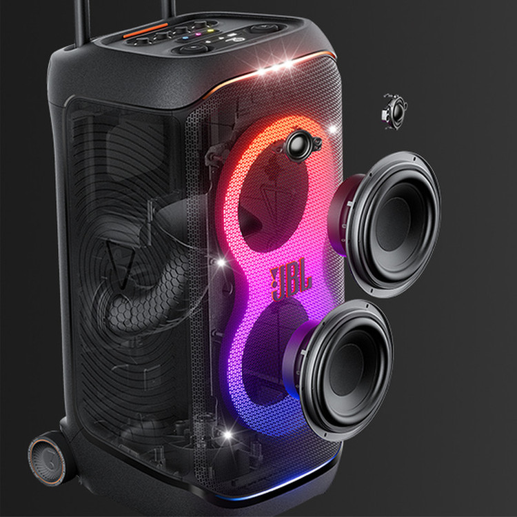 شرکت JBL همواره در زمینهی تولید تجهیزات صوتی پیشگام بوده است. پارتی باکس JBL با صدای قدرتمند و باکیفیت، توجه را به خود جلب میکند و این بار با Stage 320 توانسته تمام نیازهای شما را برای داشتن تجربه شنیداری متفاوت برآورده کند. در نمایشگاه CES 2024، جی بی ال مجموعه جدیدی از اسپیکرهای PartyBox خود را معرفی کرد که شامل اسپیکر JBL PartyBox Club 120 و اسپیکر JBL PartyBox Stage 320 میباشد. صدای ارائه شده توسط اسپیکر جی بی ال Stage 320 نمونهای برجسته از کیفیت بالای صوتی است با دو ووفر با حساسیت بالا و دو توییتر صدایی دقیق و واضح را حتی در فضای باز ارائه میدهد. استفاده از فناوری AI Sound Boost، صدایی قدرتمند و با اعوجاج کمتر را تضمین میکند. این فناوری با بهرهگیری از الگوریتمهای هوش مصنوعی، صدا را در زمان واقعی تحلیل کرده و بهینهسازی میکند، تا تجربهی شنیداری باکیفیتی را برای شنوندگان فراهم آورد. اسپیکر JBL PartyBox Stage 320 متناسب با نیازهای مهمانیهای مدرن و جابجایی آسان طراحی شده است. این محصول با اندازهای مناسب و دسته تلسکوپی و چرخهای محکم خود، حمل و نقل راحتی را فراهم میکند. انرژی لازم برای اسپیکر JBL PartyBox Stage 320 از طریق یک باتری لیتیوم یونی با ظرفیت 9444 میلیآمپر ساعت ( 68wh) تأمین میشود و زمان پخش موسیقی این اسپیکر 18 ساعت برآورد شده است. این اسپیکر از قابلیت فستشارژ نیز بهره برده است؛ به این ترتیب با 10 دقیقه قرارگرفتن در شارژ، میتواند تا 2 ساعت موسیقی پخش کند. برای شارژ شدن کامل آن نیز حدود 3 ساعت زمان نیاز است.