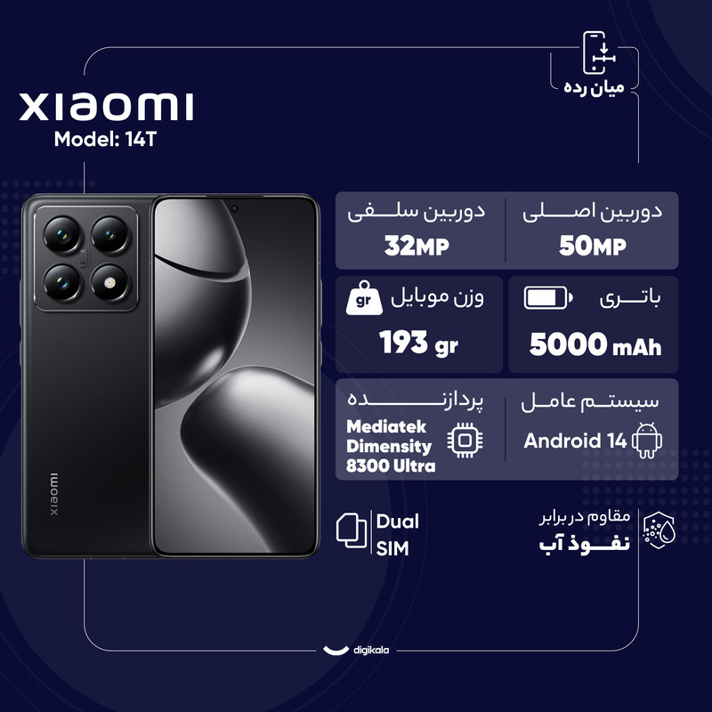 گوشی Xiaomi 14T یکی از جدیدترین و کاملترین محصولات شیائومی است که با ترکیبی از طراحی زیبا، سختافزار قدرتمند و قابلیتهای حرفهای در قالب یک قاتل پرچمدار به بازار آمده است و توجه بسیاری از کاربران و علاقهمندان به تکنولوژی را به خود جلب کرده است. این گوشی با بدنهای شیشهای در قاب جلویی و پشتی، فریم پلاستیکی باکیفیت و گواهی مقاومت IP68، هم زیباست و هم در برابر آب و گرد و غبار کاملا مقاوم است. صفحهنمایش 6.67 اینچی AMOLED با نرخ نوسازی 144 هرتز، پشتیبانی از Dolby Vision و HDR10+، یکی از بهترین تجربههای بصری را به شما هدیه میدهد. قلب تپنده این دستگاه تراشه Mediatek Dimensity 8300 Ultra است که با پردازنده گرافیکی Mali-G615 MC6 و حافظه پرسرعت UFS 4.0، برای اجرای اپلیکیشنها و سنگینترین بازیها در سریعترین حالت ممکن طراحی شده است. سیستم دوربین سهگانه 50+50+12 مگاپیکسلی با همکاری شرکت لایکا، امکانات عکاسی پیشرفتهای مانند زوم اپتیکال 2 برابری، فیلمبرداری 4K و پشتیبانی از HDR10+ را فراهم میکند. دوربین سلفی 32 مگاپیکسلی هم عملکرد فوقالعادهای دارد و این دوربین نیز توانایی فیلمبرداری 4K دارد. در نهایت، باتری 5000 میلیآمپرساعتی با شارژ سریع 67 واتی، اسپیکرهای استریو، اتصال 5G، بلوتوث نسخه 5.4 و رابط کاربری HyperOS بر پایه اندروید 14، این گوشی را به یک انتخاب فوقالعاده در کلاس قاتل پرچمدارها تبدیل کرده است.