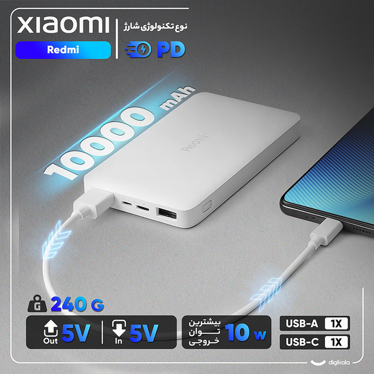 پاور بانک 10000 Redmi مدل PB100LZM ساخت شرکت شیائومی (xiaomi) به همراه یک عدد کابل شارژ 25 سانتی متری است که با داشتن دوپورت خروجی USB و پشتیبانی از انواع پروتکلهای شارژ سریع، بهترین همراه شما در خارج از منزل، محل کار و یا هنگام سفر خواهد بود. این محصول با استفاده از سیستم شارژ هوشمند به راحتی میتواند دو دستگاه را بهطور همزمان شارژ کند. ضمن این که این محصول هوشمند ورودی مناسب را برای هر دستگاه را در نظر خواهد گرفت. این محصول با ابعاد 150x73 سانتیمتر سبک و قابلحمل است و به راحتی میتوانید انواع دیوایسهای خود مانند گوشیهای هوشمند، دوربین، تبلت و غیره را در طول روز شارژ کنید. پاور بانک همراه شیائومی دارای سیستم محافظت در برابر مشکلاتی مانند نوسانات برق، اتصال کوتاه، تغییرات دما، اضافه جریان در ورودی و خروجی و غیره است. این پاور بانک از پورت خروجی دوگانه USB_A و پورت ورودی دوگانه USB-C و MicroUSB برخوردار است. همچنین حداکثر میزان قدرت برای پورت ورودی 5V _2.1A و پورت خروجی آن 5.1V_2.6A است. به علاوه این دستگاه دارای دو درگاه ورودی MicroUSB - TypeC برای شارژ است و قابلیت سازگاری با تمامی گجتهای هوشمند را دارد. در مجموع این پاور بانک با توانایی چندین بار شارژ گوشیهای هوشمند، میتواند یک انتخاب مناسب برای استفاده روزمره باشد.