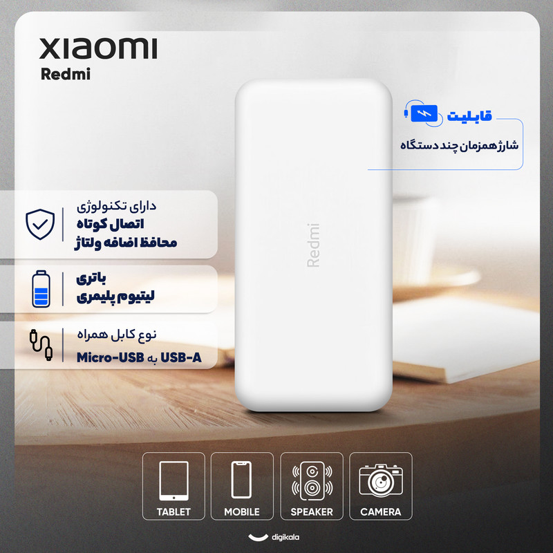 پاور بانک 10000 Redmi مدل PB100LZM ساخت شرکت شیائومی (xiaomi) به همراه یک عدد کابل شارژ 25 سانتی متری است که با داشتن دوپورت خروجی USB و پشتیبانی از انواع پروتکلهای شارژ سریع، بهترین همراه شما در خارج از منزل، محل کار و یا هنگام سفر خواهد بود. این محصول با استفاده از سیستم شارژ هوشمند به راحتی میتواند دو دستگاه را بهطور همزمان شارژ کند. ضمن این که این محصول هوشمند ورودی مناسب را برای هر دستگاه را در نظر خواهد گرفت. این محصول با ابعاد 150x73 سانتیمتر سبک و قابلحمل است و به راحتی میتوانید انواع دیوایسهای خود مانند گوشیهای هوشمند، دوربین، تبلت و غیره را در طول روز شارژ کنید. پاور بانک همراه شیائومی دارای سیستم محافظت در برابر مشکلاتی مانند نوسانات برق، اتصال کوتاه، تغییرات دما، اضافه جریان در ورودی و خروجی و غیره است. این پاور بانک از پورت خروجی دوگانه USB_A و پورت ورودی دوگانه USB-C و MicroUSB برخوردار است. همچنین حداکثر میزان قدرت برای پورت ورودی 5V _2.1A و پورت خروجی آن 5.1V_2.6A است. به علاوه این دستگاه دارای دو درگاه ورودی MicroUSB - TypeC برای شارژ است و قابلیت سازگاری با تمامی گجتهای هوشمند را دارد. در مجموع این پاور بانک با توانایی چندین بار شارژ گوشیهای هوشمند، میتواند یک انتخاب مناسب برای استفاده روزمره باشد.